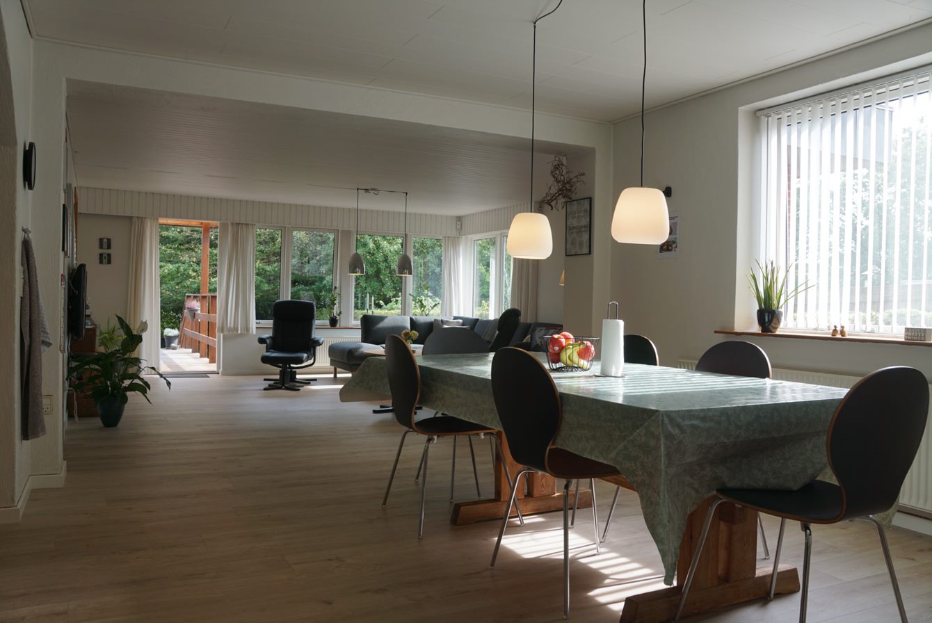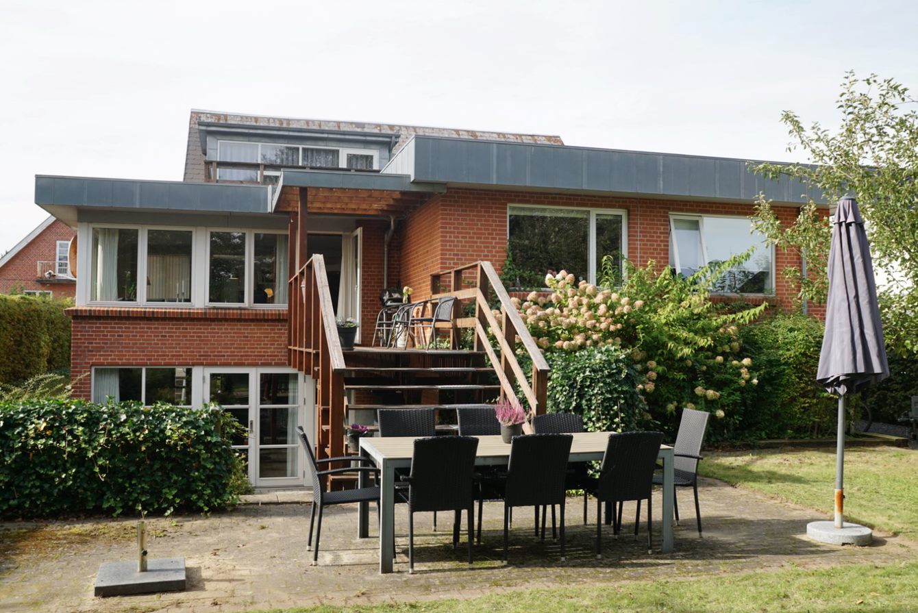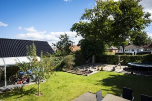 I haven som er en hyggelig lukket have, der er omkranset af høje træer, findes der en dejlig terrasse, trampolin, bålsted, hængekøje mm.